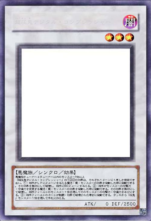 | 悪魔族チューナー+チューナー以外のモンスター1体以上 「超圧鬼デジタル・コンプレッシャー」の①②③の効果は、それぞれ1ターンに1度しか使用できない。①:相手がLPにダメージを与える魔法・罠・モンスターの効果を発動した時に発動できる。その効果を無効にして破壊し、相手に500ダメージを与える。②:相手がモンスターの攻撃力・守備力を変更する魔法・罠・モンスターの効果を発動した時に発動できる。その効果を無効にして破壊し、相手フィールドのモンスター1体を選んでそのモンスターの攻撃力・守備力を半分にする。③:相手フィールドのカードが戦闘・効果で破壊された場合に発動できる。デッキから「圧鬼」モンスター1体を選んで手札に加える。 | |||