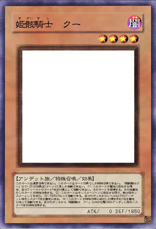 | このカードは通常召喚できない。このカードはカード効果でしか特殊召喚できない。「姫骸騎士クー」の(1)(3)の効果は1ターンに1度しか発動できない。(1):このカードが墓地に存在する場合、自分フィールドのカード1枚を対象にして発動できない。そのカードを破壊する。その後墓地のこのカードを特殊召喚する。(2):このカードはモンスターゾーンに存在する限り、戦士族モンスターとしても扱う。(3):1000LP払って発動できる。自分のデッキからレベル4以下のアンデット族モンスター1体を墓地に送る。(4):このカードを特殊召喚に成功した場合手札1枚を墓地に送って発動できる。自分のデッキから「姫骸騎士 クー」以外の攻撃力0のアンデット族モンスター1体を特殊召喚する。 | |||