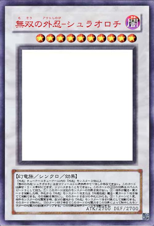 | 「外忍」チューナー+チューナー以外の「外忍」モンスター2体以上 「無双の外忍-シュラオロチ」は自分フィールドに表側表示で1体しか存在できない。このカードは融合・S・X素材にできず、リリースすることもできない。このカードの②③の効果はスペルスピード3として扱う。①:このカードは他のモンスターの効果を受けない。②:相手が魔法・罠カードを発動した時、手札から「外忍」モンスター1枚または「外道忍術」魔法・罠カード1枚を捨てて発動できる。その発動を無効にし、そのカードを自分の手札に加える。③:1ターンに1度、相手モンスターの攻撃宣言時、自分の墓地から「外忍」モンスター1体を対象にして発動できる。そのカードを除外し、次のターン終了時までこのカードの攻撃力をこの効果によって除外したモンスターの攻撃力の数値分アップする。この効果は相手ターンでも発動できる。 | |||