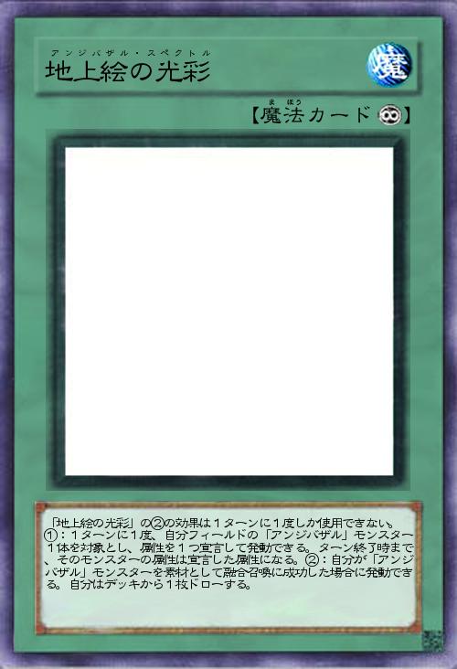 | 「地上絵の光彩」の②の効果は1ターンに1度しか使用できない。 ①:1ターンに1度、自分フィールドの「アンジバザル」モンスター1体を対象とし、属性を1つ宣言して発動できる。ターン終了時まで、そのモンスターの属性は宣言した属性になる。②:自分が「アンジバザル」モンスターを素材として融合召喚に成功した場合に発動できる。自分はデッキから1枚ドローする。 | |||