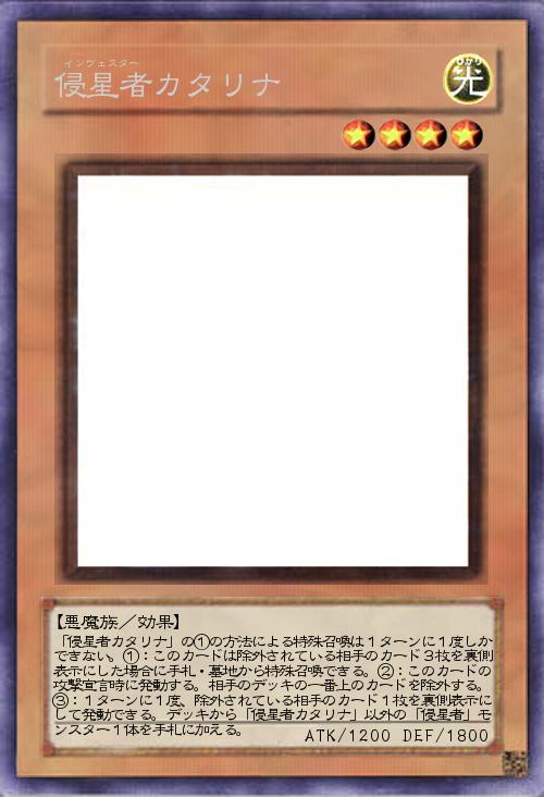 | 「侵星者カタリナ」の①の方法による特殊召喚は1ターンに1度しかできない。①:このカードは除外されている相手のカード3枚を裏側表示にした場合に手札・墓地から特殊召喚できる。②:このカードの攻撃宣言時に発動する。相手のデッキの一番上のカードを除外する。③:1ターンに1度、除外されている相手のカード1枚を裏側表示にして発動できる。デッキから「侵星者カタリナ」以外の「侵星者」モンスター1体を手札に加える。 | |||