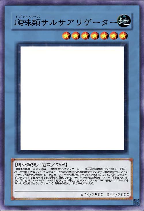 | 「調味の儀式」により降臨。「爬味類サルサアリゲーター」の②③の効果はそれぞれ1ターンに1度しか使用できない。①:このカードが特殊召喚された表側表示モンスターと戦闘を行うダメージステップ開始時に発動する。そのモンスターの攻撃力をターン終了時まで0にする。②:このカードがデッキから墓地へ送られた場合に発動できる。デッキから爬虫類族モンスター1体を墓地に送る。③:自分フィールドにカードが存在しない場合、自分メインフェイズ時に墓地のこのカードを除外して発動できる。デッキから「調味の儀式」1枚を手札に加える。 | |||