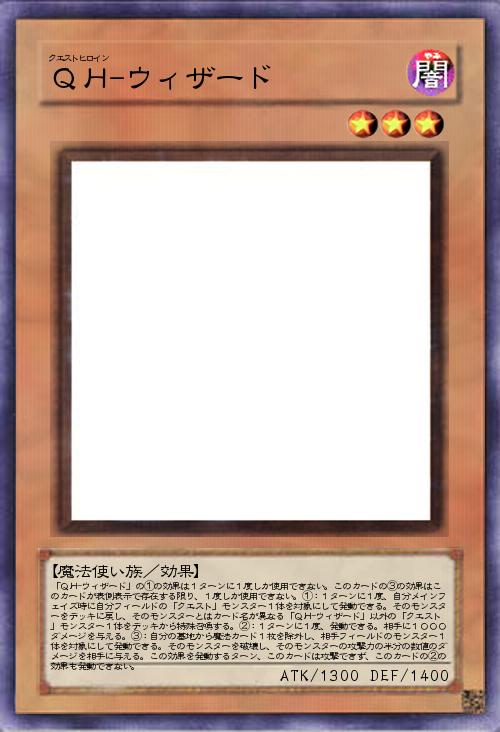 | 「QH-ウィザード」の①の効果は1ターンに1度しか使用できない。このカードの③の効果はこのカードが表側表示で存在する限り、1度しか使用できない。①:1ターンに1度、自分メインフェイズ時に自分フィールドの「クエスト」モンスター1体を対象にして発動できる。そのモンスターをデッキに戻し、そのモンスターとはカード名が異なる「QH-ウィザード」以外の「クエスト」モンスター1体をデッキから特殊召喚する。②:1ターンに1度、発動できる。相手に1000ダメージを与える。③:自分の墓地から魔法カード1枚を除外し、相手フィールドのモンスター1体を対象にして発動できる。そのモンスターを破壊し、そのモンスターの攻撃力の半分の数値のダメージを相手に与える。この効果を発動するターン、このカードは攻撃できず、このカードの②の効果も発動できない。 | |||
