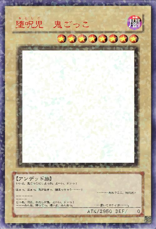 | いいよ、鬼ごっこにしよっか。よーい、ドンっ! はぁっ、はぁっ。急がなきゃ、捕まっちゃう………! …………あれ?ここ、何処だr ------ ---- じゃあ、次は、わたしが鬼。よーい、ドンっ! ---みんな、待ってっ。速いよ、みんなっ。 ……置いてカナイデ………。 | |||