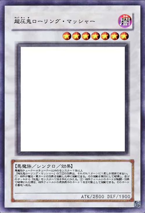 | 悪魔族チューナー+チューナー以外のモンスター1体以上 「超圧鬼ローリング・マッシャー」の①②の効果は、それぞれ1ターンに1度しか使用できない。①:相手が魔法・罠カードの効果を発動した時に発動できる。その発動を無効にして破壊し、自分のデッキから「圧鬼」モンスター1体を手札に加える。②:相手フィールドのカードが戦闘・効果で破壊された場合、相手フィールドの表側表示のカード1枚を対象として発動できる。そのカードを墓地へ送る。 | |||