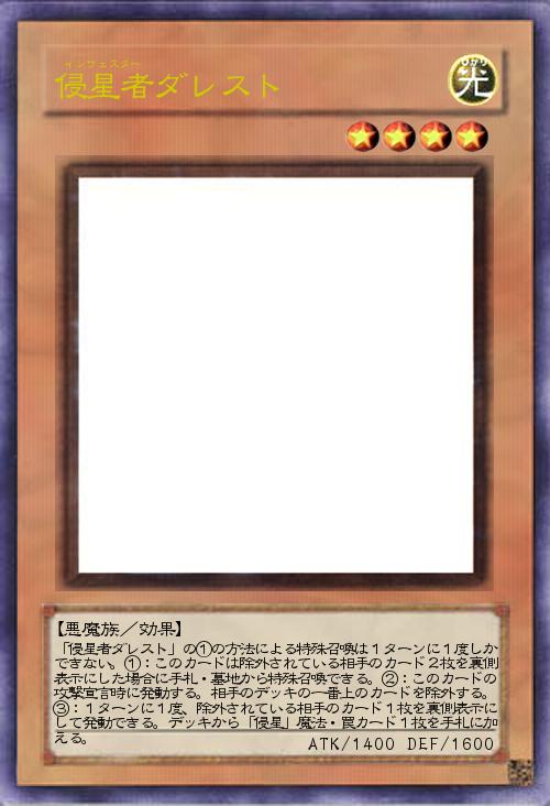 | 「侵星者ダレスト」の①の方法による特殊召喚は1ターンに1度しかできない。①:このカードは除外されている相手のカード2枚を裏側表示にした場合に手札・墓地から特殊召喚できる。②:このカードの攻撃宣言時に発動する。相手のデッキの一番上のカードを除外する。③:1ターンに1度、除外されている相手のカード1枚を裏側表示にして発動できる。デッキから「侵星」魔法・罠カード1枚を手札に加える。 | |||