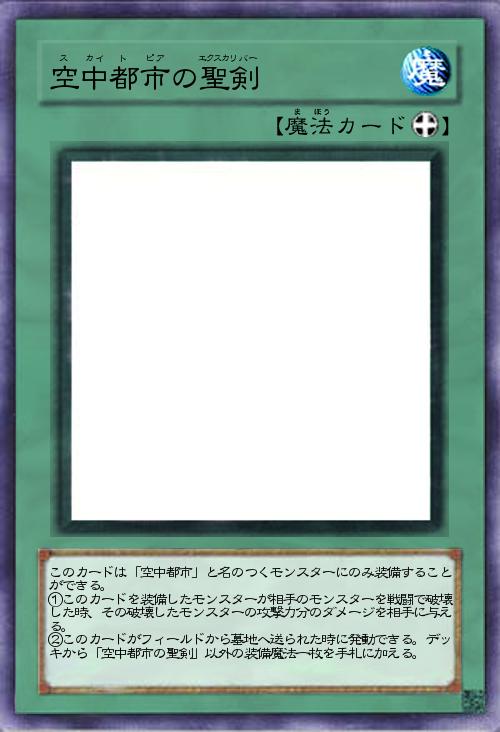 | このカードは「空中都市」と名のつくモンスターにのみ装備することができる。 ①このカードを装備したモンスターが相手のモンスターを戦闘で破壊した時、その破壊したモンスターの攻撃力分のダメージを相手に与える。 ②このカードがフィールドから墓地へ送られた時に発動できる。デッキから「空中都市の聖剣」以外の装備魔法一枚を手札に加える。 | |||