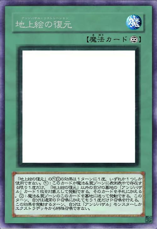 | 「地上絵の復元」の①②の効果は1ターンに1度、いずれか1つしか使用できない。①:このカードが魔法&罠ゾーンに表側表示で存在する限り1度だけ、「地上絵の復元」以外の自分の墓地の「アンジバザル」カード1枚を対象として発動できる。そのカードを手札に加える。②:魔法&罠ゾーンのこのカードを墓地に送って発動できる。このターン、自分は通常のP召喚に加えてもう1度だけP召喚を行える。この効果を発動するターン、自分は「アンジバザル」モンスターしかエクストラデッキから特殊召喚できない。 | |||