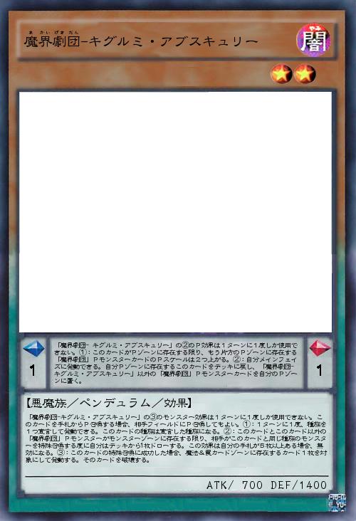 | 「魔界劇団-キグルミ・アブスキュリー」の②のP効果は1ターンに1度しか使用できない。①:このカードがPゾーンに存在する限り、もう片方のPゾーンに存在する「魔界劇団」PモンスターカードのPスケールは2つ上がる。②:自分メインフェイズに発動できる。自分Pゾーンに存在するこのカードをデッキに戻し、「魔界劇団-キグルミ・アブスキュリー」以外の「魔界劇団」Pモンスターカードを自分のPゾーンに置く。 | |||