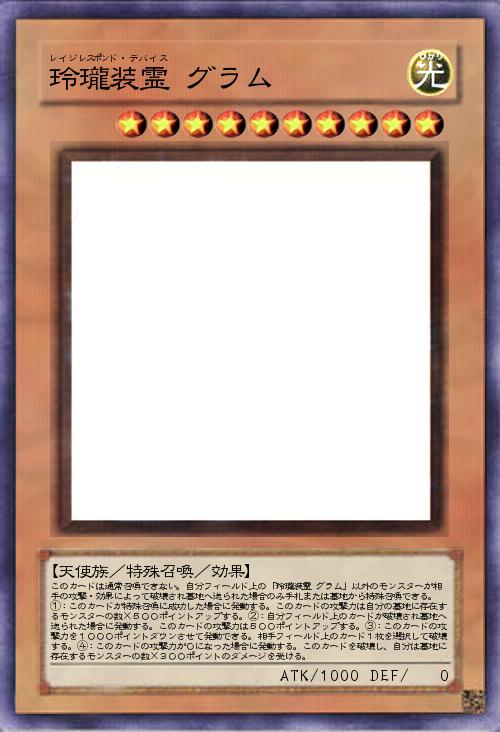 | このカードは通常召喚できない。自分フィールド上の「玲瓏装霊 グラム」以外のモンスターが相手の攻撃・効果によって破壊され墓地へ送られた場合のみ手札または墓地から特殊召喚できる。 ①:このカードが特殊召喚に成功した場合に発動する。このカードの攻撃力は自分の墓地に存在するモンスターの数×500ポイントアップする。②:自分フィールド上のカードが破壊され墓地へ送られた場合に発動する。このカードの攻撃力は500ポイントアップする。③:このカードの攻撃力を1000ポイントダウンさせて発動できる。相手フィールド上のカード1枚を選択して破壊する。④:このカードの攻撃力が0になった場合に発動する。このカードを破壊し、自分は墓地に存在するモンスターの数×300ポイントのダメージを受ける。 | |||