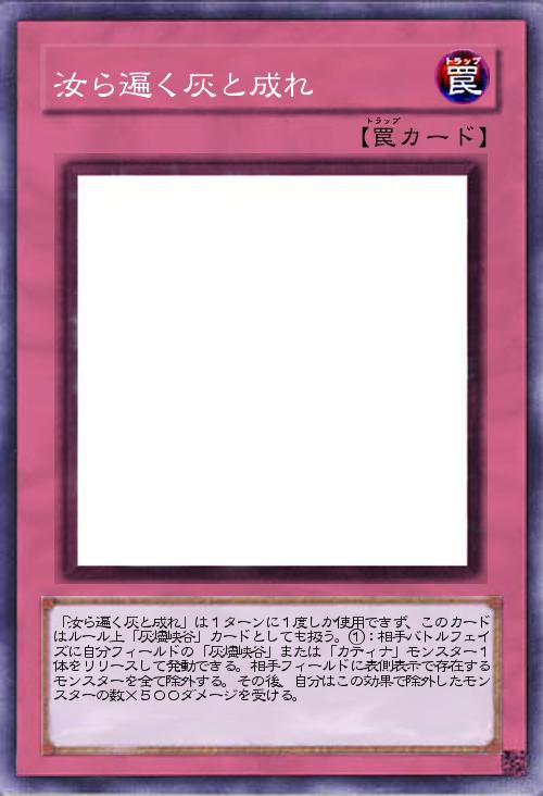 | 「汝ら遍く灰と成れ」は1ターンに1度しか使用できず、このカードはルール上「灰燼峡谷」カードとしても扱う。①:相手バトルフェイズに自分フィールドの「灰燼峡谷」または「カティナ」モンスター1体をリリースして発動できる。相手フィールドに表側表示で存在するモンスターを全て除外する。その後、自分はこの効果で除外したモンスターの数×500ダメージを受ける。 | |||