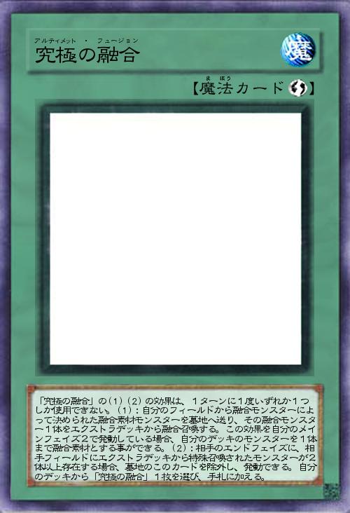 | 「究極の融合」の(1)(2)の効果は、1ターンに1度いずれか1つしか使用できない。(1):自分のフィールドから融合モンスターによって決められた融合素材モンスターを墓地へ送り、その融合モンスター1体をエクストラデッキから融合召喚する。この効果を自分のメインフェイズ2で発動している場合、自分のデッキのモンスターを1体まで融合素材とする事ができる。(2):相手のエンドフェイズに、相手フィールドにエクストラデッキから特殊召喚されたモンスターが2体以上存在する場合、墓地のこのカードを除外し、発動できる。自分のデッキから「究極の融合」1枚を選び、手札に加える。 | |||