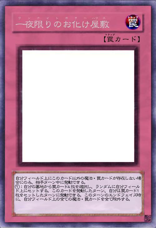 | 自分フィールド上にこのカード以外の魔法・罠カードが存在しない場合にのみ、相手ターン中に発動できる。 ①:自分の墓地から罠カード4枚を選択し、ランダムに自分フィールド上にセットする。このカードを発動したターン、自分は罠カード1枚をセットしたターンに発動できる。このターンのエンドフェイズ時に、自分フィールド上の全ての魔法・罠カードを全て除外する。 | |||