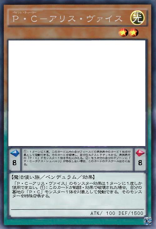 | 「P・C-アリス・ヴァイス」のモンスター効果は1ターンに1度しか使用できない。①:このカードが戦闘・効果で破壊された場合、自分の墓地の「P・C」モンスター1体を対象として発動できる。そのモンスターを特殊召喚する。 | |||