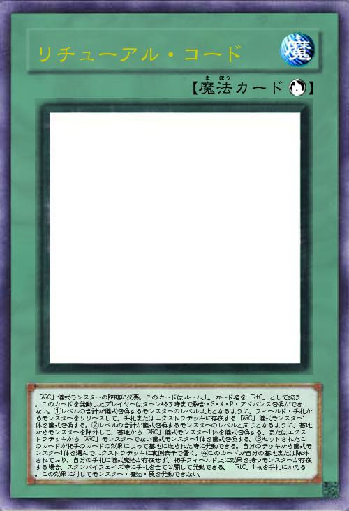 | 「ARC」儀式モンスターの降臨に必要。このカードはルール上、カード名を「RtC」として扱う。このカードを発動したプレイヤーはターン終了時まで融合・S・X・P・アドバンス召喚ができない。①レベルの合計が儀式召喚するモンスターのレベル以上となるように、フィールド・手札からモンスターをリリースして、手札またはエクストラデッキに存在する「ARC」儀式モンスター1体を儀式召喚する。②レベルの合計が儀式召喚するモンスターのレベルと同じとなるように、墓地からモンスターを除外して、墓地から「ARC」儀式モンスター1体を儀式召喚する、またはエクストラデッキから「ARC」モンスターでない儀式モンスター1体を儀式召喚する。③セットされたこのカードが相手のカードの効果によって墓地に送られた時に発動できる。自分のデッキから儀式モンスター1体を選んでエクストラデッキに裏側表示で置く。④このカードが自分の墓地または除外 | |||