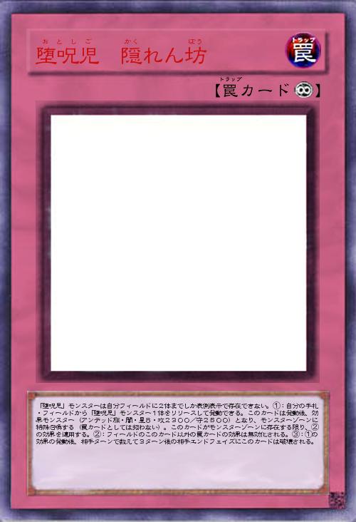 | 「堕呪児」モンスターは自分フィールドに2体までしか表側表示で存在できない。①:自分の手札・フィールドから「堕呪児」モンスター1体をリリースして発動できる。このカードは発動後、効果モンスター(アンデッド族・闇・星8・攻2300/守2500)となり、モンスターゾーンに特殊召喚する(罠カードとしては扱わない)。このカードがモンスターゾーンに存在する限り、②の効果を適用する。②:フィールドのこのカード以外の罠カードの効果は無効化される。③:①の効果の発動後、相手ターンで数えて3ターン後の相手エンドフェイズにこのカードは破壊される。 | |||