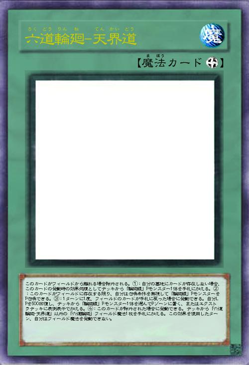 | このカードがフィールドから離れる場合除外される。①:自分の墓地にカードが存在しない場合、このカードの発動時の効果処理としてデッキから「輪廻蝶」Pモンスター1体を手札に加える。②:このカードがフィールドに存在する限り、自分は召喚条件を無視して「輪廻蝶」PモンスターをP召喚できる。③:1ターンに1度、フィールドのカードが手札に戻った場合に発動できる。自分LPを500回復し、デッキから「輪廻蝶」Pモンスター1体を選んでPゾーンに置く、またはエクストラデッキに表側表示で加える。④:このカードが除外された場合に発動できる。デッキから「六道輪廻-天界道」以外の「六道輪廻」フィールド魔法1枚を手札に加える。この効果を使用したターン、自分はフィールド魔法を発動できない。 | |||