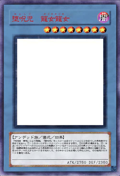 | 「呪祝詞 褥唄」により降臨。「堕呪児」モンスターは自分フィールドに2体までしか表側表示で存在できない。①:このカードがモンスターゾーンに存在する限り、②の効果を適用する。②:お互いのプレイヤーへの3000以上の戦闘ダメージ及び1000以上の効果ダメージは0になる。③:戦闘破壊または相手により表側表示のこのカードがフィールドから離れた場合に発動できる。自分のデッキの上からカードを5枚めくり、その中から2枚を選んで手札に加え、その後残りのカードを墓地へ送る。 | |||
