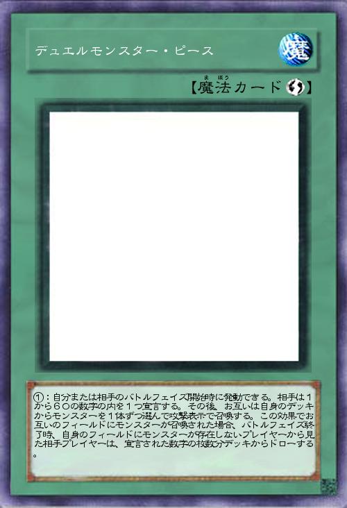 | ①:自分または相手のバトルフェイズ開始時に発動できる。相手は1から60の数字の内を1つ宣言する。その後、お互いは自身のデッキからモンスターを1体ずつ選んで攻撃表示で召喚する。この効果でお互いのフィールドにモンスターが召喚された場合、バトルフェイズ終了時、自身のフィールドにモンスターが存在しないプレイヤーから見た相手プレイヤーは、宣言された数字の枚数分デッキからドローする。 | |||