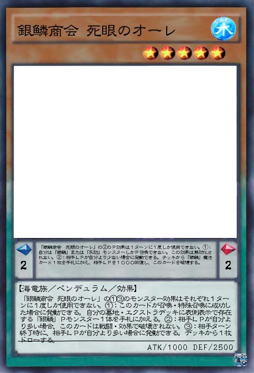 | 「銀鱗商会 死眼のオーレ」の①③のモンスター効果はそれぞれ1ターンに1度しか使用できない。①:このカードが召喚・特殊召喚に成功した場合に発動できる。自分の墓地・エクストラデッキに表側表示で存在する「銀鱗」Pモンスター1体を手札に加える。②:相手LPが自分より多い場合、このカードは戦闘・効果で破壊されない。③:相手ターン終了時に、相手LPが自分より多い場合に発動できる。デッキから1枚ドローする。 | |||
