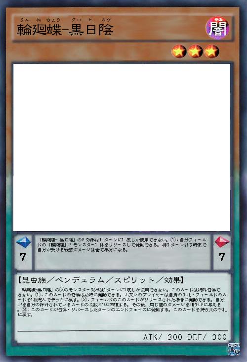 | 「輪廻蝶-黒日陰」の②のモンスター効果は1ターンに1度しか使用できない。このカードは特殊召喚できない。①:このカードの召喚成功時に発動できる。お互いのプレイヤーは自身の手札・フィールドのカードを1枚選んでデッキに戻す。②:フィールドのこのカードがリリースされた場合に発動できる。自分LPを自分の除外されているカードの枚数×100回復する。その後、同じ値のダメージを相手LPに与える。③:このカードが召喚・リバースしたターンのエンドフェイズに発動する。このカードを持ち主の手札に戻す。 | |||
