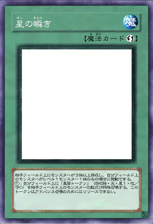 | 相手フィールド上にモンスターが3体以上存在し、自分フィールド上のモンスターがレベル1モンスター1体のみの場合に発動できる。 ①:自分フィールド上に「星屑トークン」(岩石族・光・星1・攻/守0)を相手フィールド上のモンスターの数だけ特殊召喚する。このトークンはアドバンス召喚のためにはリリースできない。 | |||