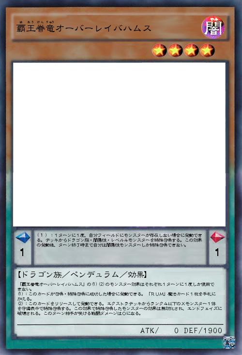 | 「覇王眷竜オーバーレイバハムス」の(1)(2)のモンスター効果はそれぞれ1ターンに1度しか使用できない。 (1):このカードが召喚・特殊召喚に成功した場合に発動できる。「RUM」魔法カード1枚を手札に加える。 (2):このカードをリリースして発動できる。エクストラデッキからランク4以下のXモンスター1体を守備表示で特殊召喚する。この効果で特殊召喚したモンスターの効果は無効化され、エンドフェイズに破壊される。このターン相手が受ける戦闘ダメージは0になる。 | |||