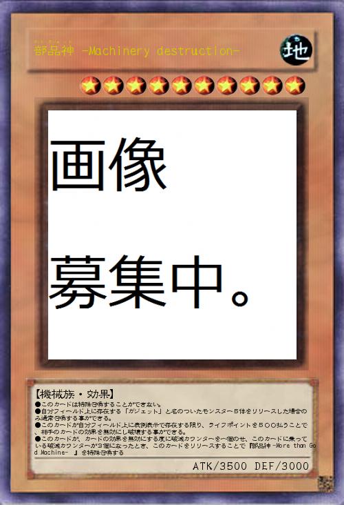 ●このカードは特殊召喚することができない。 ●自分フィールド上に存在する「ガジェット」と名のついたモンスター5体をリリースした場合のみ通常召喚する事ができる。 ●このカードが自分フィールド上に表側表示で存在する限り、ライフポイントを500払うことで、相手のカードの効果を無効にし破壊する事ができる。 ●このカードが、カードの効果を無効にする度に破滅カウンターを一個のせ、このカードに乗っている破滅カウンターが3個になったとき、このカードをリリースすることで『部品神 -More than God Machine- 』を特殊召喚する |