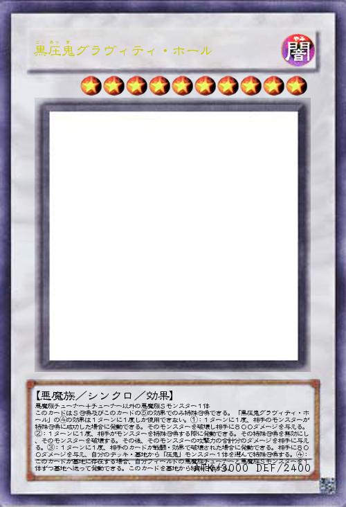 | 悪魔族チューナー+チューナー以外の悪魔族Sモンスター1体 このカードはS召喚及びこのカードの⑤の効果でのみ特殊召喚できる。「黒圧鬼グラヴィティ・ホール」の④の効果は1ターンに1度しか使用できない。①:1ターンに1度、相手のモンスターが特殊召喚に成功した場合に発動できる。そのモンスターを破壊し相手に800ダメージを与える。②:1ターンに1度、相手がモンスターを特殊召喚する際に発動できる。その特殊召喚を無効にし、そのモンスターを破壊する。その後、そのモンスターの攻撃力の合計分のダメージを相手に与える。③:1ターンに1度、相手のカードが戦闘・効果で破壊された場合に発動できる。相手に800ダメージを与え、自分のデッキ・墓地から「圧鬼」モンスター1体を選んで特殊召喚する。④:このカードが墓地に存在する場合、自分フィールドの悪魔族チューナーと悪魔族Sモンスターを1体ずつ墓地へ送って発動できる。このカー | |||