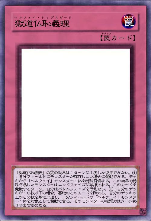 | 「獄道仏恥義理」の②の効果は1ターンに1度しか使用できない。①:自分フィールドにモンスターが存在しない場合に発動できる。デッキから「ヘルウェイ」モンスター1体を特殊召喚する。この効果で特殊召喚したモンスターはエンドフェイズに破壊される。このカードを発動するターン、自分はバトルフェイズを行えない。②:自分のデッキが10枚以下の場合、墓地のこのカードを除外し、自分のデッキの上から2枚を墓地に送り、自分フィールドの「ヘルウェイ」モンスター1体を対象として発動できる。そのモンスターの攻撃力はターン終了時まで倍になる。 | |||