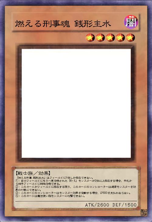 | 「燃える刑事 銭形主水」はフィールドに1体しか存在できない。 ①:自分フィールドにもう一度召喚された「M・E」モンスターが2体以上存在する場合、手札から相手フィールドに特殊召喚できる。 ②:このカードがフィールドに存在する限り、このカードのコントローラーは通常モンスターを効果の対象にできない。 ③:このカードのコントローラーはモンスター効果を発動する場合、LP500を支払わならない。 ④:このカードは魔法使い族モンスターに攻撃できない。 | |||