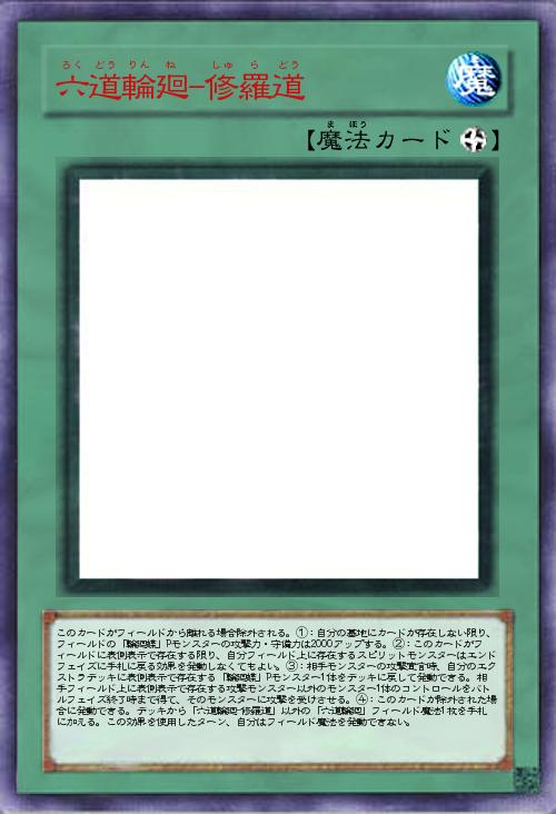 | このカードがフィールドから離れる場合除外される。①:自分の墓地にカードが存在しない限り、フィールドの「輪廻蝶」Pモンスターの攻撃力・守備力は2000アップする。②:このカードがフィールドに表側表示で存在する限り、自分フィールド上に存在するスピリットモンスターはエンドフェイズに手札に戻る効果を発動しなくてもよい。③:相手モンスターの攻撃宣言時、自分のエクストラデッキに表側表示で存在する「輪廻蝶」Pモンスター1体をデッキに戻して発動できる。相手フィールド上に表側表示で存在する攻撃モンスター以外のモンスター1体のコントロールをバトルフェイズ終了時まで得て、そのモンスターに攻撃を受けさせる。④:このカードが除外された場合に発動できる。デッキから「六道輪廻-修羅道」以外の「六道輪廻」フィールド魔法1枚を手札に加える。この効果を使用したターン、自分はフィールド魔法を発動できない。 | |||