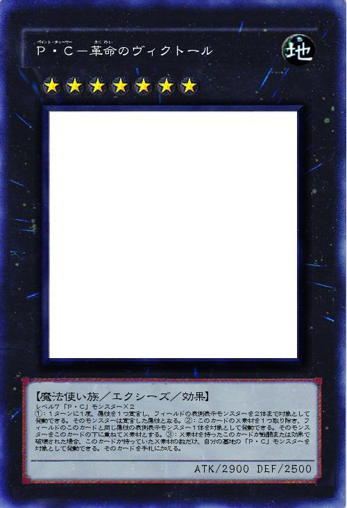 | レベル7「P・C」モンスター×2 ①:1ターンに1度、属性を1つ宣言し、フィールドの表側表示モンスターを2体まで対象として発動できる。そのモンスターは宣言した属性となる。②:このカードのX素材を1つ取り除き、フィールドのこのカードと同じ属性の表側表示モンスター1体を対象として発動できる。そのモンスターをこのカードの下に重ねてX素材とする。③:X素材を持ったこのカードが戦闘または効果で破壊された場合、このカードが持っていたX素材の数だけ、自分の墓地の「P・C」モンスターを対象として発動できる。そのカードを手札に加える。 | |||
