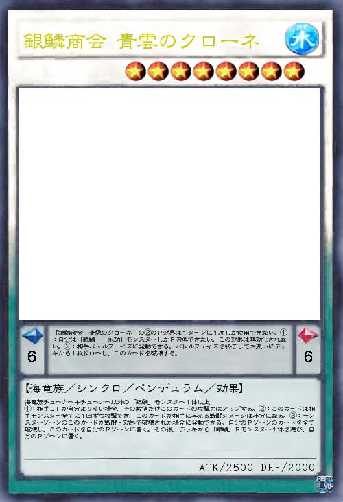 | 海竜族チューナー+チューナー以外の「銀鱗」モンスター1体以上 ①:相手LPが自分より多い場合、その数値だけこのカードの攻撃力はアップする。②:このカードは相手モンスター全てに1回ずつ攻撃でき、このカードが相手に与える戦闘ダメージは半分になる。③:モンスターゾーンのこのカードが戦闘・効果で破壊された場合に発動できる。自分のPゾーンのカードを全て破壊し、このカードを自分のPゾーンに置く。その後、デッキから「銀鱗」Pモンスター1体を選び、自分のPゾーンに置く。 | |||