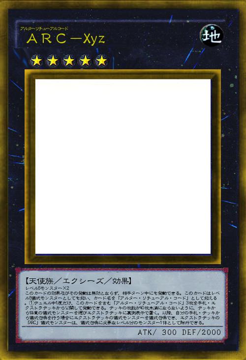 | レベル5モンスター×2 このカードの効果及びその発動は無効とならず、相手ターン中にも発動できる。このカードはレベル5儀式モンスターとしても扱い、カード名を「アルター・リチューアル・コード」として扱える。①デュエル中1度だけ、このカードを含む「アルター・リチューアル・コード」3枚を手札・エクストラデッキから公開して発動できる。デッキの枚数が40枚未満にならないように、デッキから任意の儀式モンスターを選びエクストラデッキに裏側表示で置く。以降、自分の手札・デッキから儀式召喚を行う場合にエクストラデッキの儀式モンスターを儀式召喚でき、エクストラデッキの「ARC」儀式モンスターは、儀式召喚に必要なレべル分のモンスター1体として除外できる。 | |||
