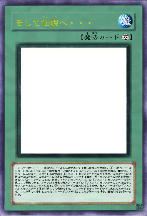 | 「そして伝説へ・・・」は自分フィールドに表側表示で1枚しか存在できない。①:自分フィールドの「クエスト」モンスターは攻撃力・守備力が500アップし、以下の効果を得る。●自分フィールドにこのカードとカード名が異なる「クエスト」モンスターが存在する限り、このカードの効果は無効にされず、このカードの効果の発動に対して相手は魔法・罠・モンスターの効果を発動できない。②:1ターンに1度、自分フィールドのレベル4以下の「クエスト」モンスター1体を対象にして発動できる。ターン終了時まで自分フィールドの「クエスト」モンスターのレベルはそのモンスターと同じレベルになる。③:このカードが墓地に存在する時、自分フィールドの「クエスト」Xモンスター1体を対象にして発動できる。このカードをそのカードの下に重ねてX素材とする。この効果でX素材となったこのカードがX素材として取り除かれる場合、墓地に送らず除外される。 | |||