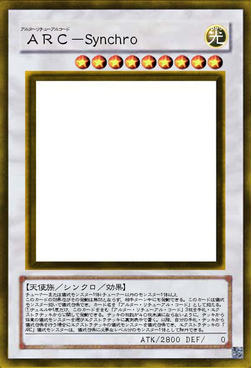 | チューナーまたは儀式モンスター1体+チューナー以外のモンスター1体以上 このカードの効果及びその発動は無効とならず、相手ターン中にも発動できる。このカードは儀式モンスター扱いで儀式召喚でき、カード名を「アルター・リチューアル・コード」として扱える。①デュエル中1度だけ、このカードを含む「アルター・リチューアル・コード」3枚を手札・エクストラデッキから公開して発動できる。デッキの枚数が40枚未満にならないように、デッキから任意の儀式モンスターを選びエクストラデッキに裏側表示で置く。以降、自分の手札・デッキから儀式召喚を行う場合にエクストラデッキの儀式モンスターを儀式召喚でき、エクストラデッキの「ARC」儀式モンスターは、儀式召喚に必要なレベル分のモンスター1体として除外できる。 | |||