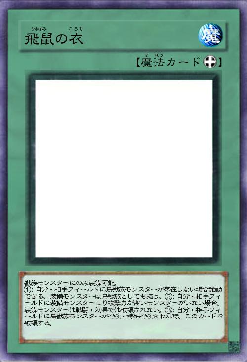 | 獣族モンスターにのみ装備可能。 ①:自分・相手フィールドに鳥獣族モンスターが存在しない場合発動できる。装備モンスターは鳥獣族としても扱う。②:自分・相手フィールドに装備モンスターより攻撃力が高いモンスターがいない場合、装備モンスターは戦闘・効果では破壊されない。③:自分・相手フィールドに鳥獣族モンスターが召喚・特殊召喚された時、このカードを破壊する。 | |||