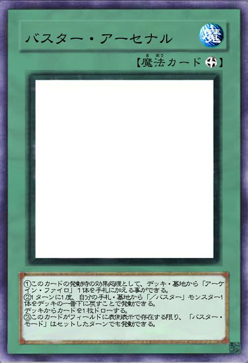 | ①このカードの発動時の効果処理として、デッキ・墓地から「アーケイン・ファイロ」1体を手札に加える事ができる。 ②1ターンに1度、自分の手札・墓地から「/バスター」モンスター1体をデッキの一番下に戻すことで発動できる。 デッキからカードを1枚ドローする。 ③このカードがフィールドに表側表示で存在する限り、「バスター・モード」はセットしたターンでも発動できる。 | |||