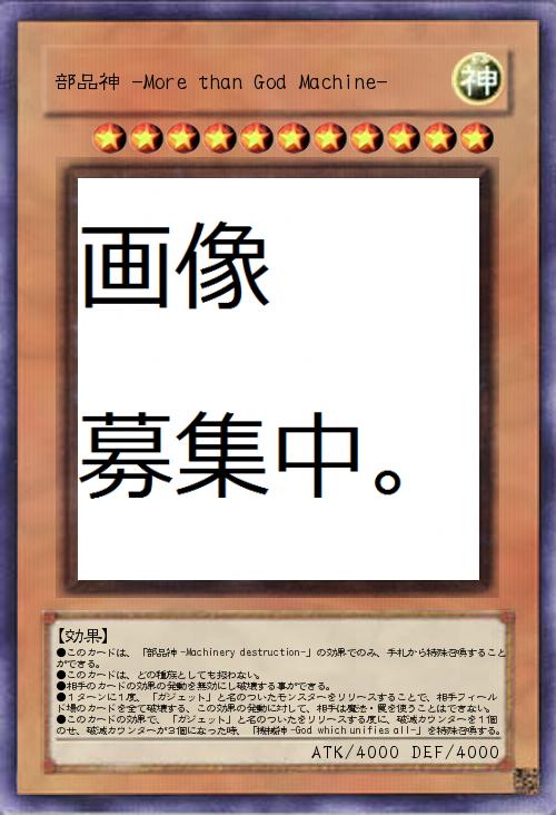 ●このカードは、「部品神 -Machinery destruction-」の効果でのみ、手札から特殊召喚することができる。 ●このカードは、どの種族としても扱わない。 ●相手のカードの効果の発動を無効にし破壊する事ができる。 ●1ターンに1度、「ガジェット」と名のついたモンスターをリリースすることで、相手フィールド場のカードを全て破壊する、この効果の発動に対して、相手は魔法・罠を使うことはできない。 ●このカードの効果で、「ガジェット」と名のついたをリリースする度に、破滅カウンターを1個のせ、破滅カウンターが3個になった時、「機械神 -God which unifies all-」を特殊召喚する。 |