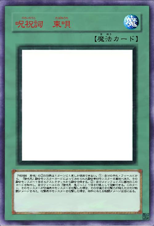 | 「呪祝詞 束唄」の②の効果は1ターンに1度しか使用できない。①:自分の手札・フィールドから、「堕呪児」融合モンスターカードによって決められた融合素材モンスターを墓地へ送り、その融合モンスター1体をエクストラデッキから融合召喚する。②:自分メインフェイズに墓地のこのカードを除外し、自分フィールドの「堕呪児 鬼ごっこ」1体を対象として発動できる。このターン、そのモンスターが守備表示モンスターを攻撃した場合、その守備力を攻撃力が超えた分だけ戦闘ダメージを与え、攻撃表示モンスターを攻撃した場合、相手に与える戦闘ダメージは倍になる。 | |||