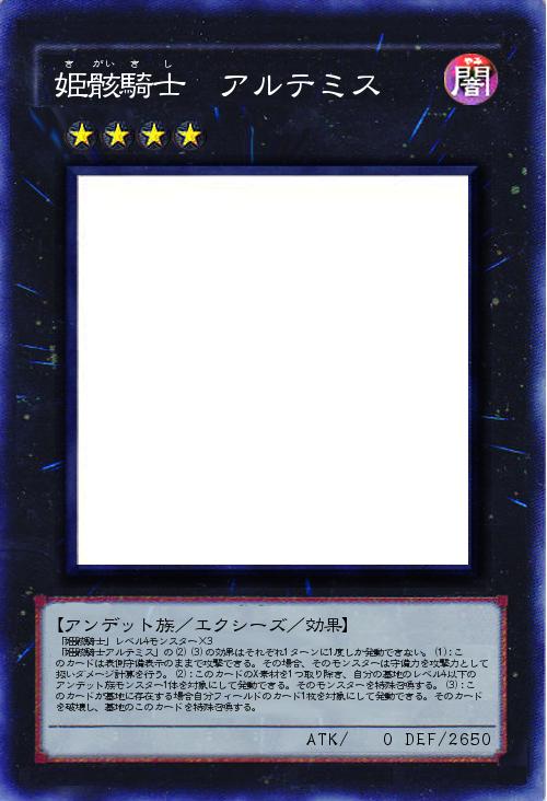 | 「姫骸騎士」レベル4モンスター×3 「姫骸騎士アルテミス」の(2)(3)の効果はそれぞれ1ターンに1度しか発動できない。(1):このカードは表側守備表示のままで攻撃できる。その場合、そのモンスターは守備力を攻撃力として扱いダメージ計算を行う。(2):このカードのX素材を1つ取り除き、自分の墓地のレベル4以下のアンデット族モンスター1体を対象にして発動できる。そのモンスターを特殊召喚する。(3):このカードが墓地に存在する場合自分フィールドのカード1枚を対象にして発動できる。そのカードを破壊し、墓地のこのカードを特殊召喚する。 | |||