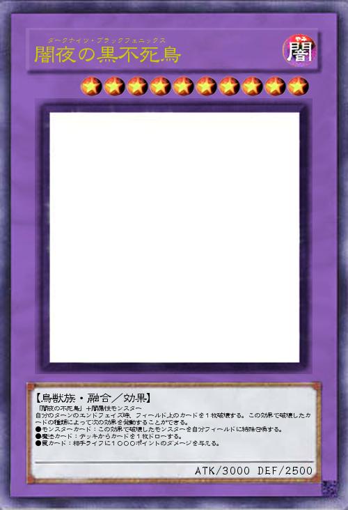 「闇夜の不死鳥」+闇属性モンスター 自分のターンのエンドフェイズ時、フィールド上のカードを1枚破壊する。この効果で破壊したカードの種類によって次の効果を発動することができる。 ●モンスターカード:この効果で破壊したモンスターを自分フィールドに特殊召喚する。 ●魔法カード:デッキからカードを1枚ドローする。 ●罠カード:相手ライフに1000ポイントのダメージを与える。 |