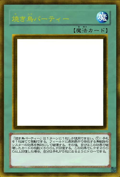 | 「焼き鳥パーティー」は1ターンに1枚しか使用できない。①:手札を1枚捨てて発動できる。フィールドに表側表示で存在する鳥獣族モンスターの効果を無効にして破壊する。その後、自分はこの効果で破壊したカードの枚数×500LP回復する。この効果でLPを2000以上回復した場合、自分は手札が5枚になるようにドローできる。 | |||