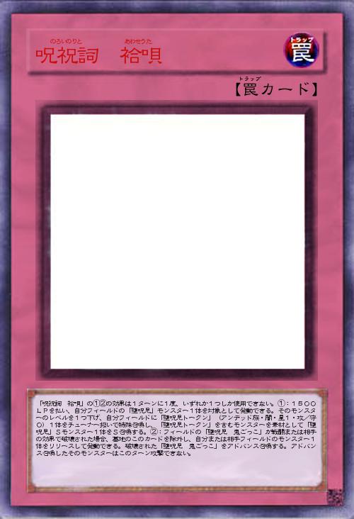 | 「呪祝詞 袷唄」の①②の効果は1ターンに1度、いずれか1つしか使用できない。①:1500LPを払い、自分フィールドの「堕呪児」モンスター1体を対象として発動できる。そのモンスターのレベルを1つ下げ、自分フィールドに「堕呪児トークン」(アンデッド族・闇・星1・攻/守0)1体をチューナー扱いで特殊召喚し、「堕呪児トークン」を含むモンスターを素材として「堕呪児」Sモンスター1体をS召喚する。②:フィールドの「堕呪児 鬼ごっこ」が戦闘または相手の効果で破壊された場合、墓地のこのカードを除外し、自分または相手フィールドのモンスター1体をリリースして発動できる。破壊された「堕呪児 鬼ごっこ」をアドバンス召喚する。アドバンス召喚したそのモンスターはこのターン攻撃できない。 | |||