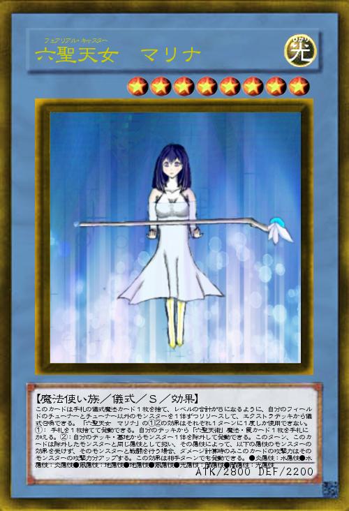 | このカードは手札の儀式魔法カード1枚を捨て、レベルの合計が8になるように、自分のフィールドのチューナーとチューナー以外のモンスターを1体ずつリリースして、エクストラデッキから儀式召喚できる。「六聖天女 マリナ」の①②の効果はそれぞれ1ターンに1度しか使用できない。①: 手札を1枚捨てて発動できる。自分のデッキから「六聖天術」魔法・罠カード1枚を手札に加える。②:自分のデッキ・墓地からモンスター1体を除外して発動できる。このターン、このカードは除外したモンスターと同じ属性として扱い、その属性によって、以下の属性のモンスターの効果を受けず、そのモンスターと戦闘を行う場合、ダメージ計算時のみこのカードの攻撃力はそのモンスターの攻撃力分アップする。この効果は相手ターンでも発動できる。●炎属性:水属性●水属性:炎属性●風属性:地属性●地属性●風属性●光属性:闇属性●闇属性:光属性 | |||