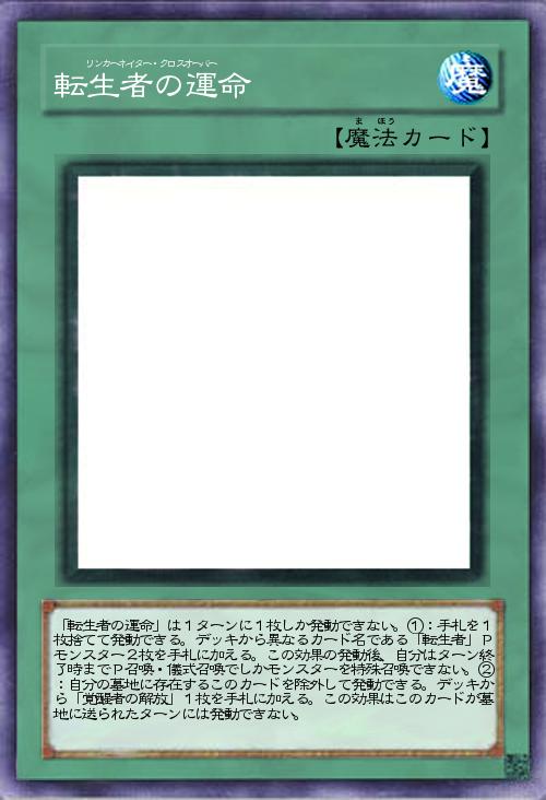 | 「転生者の運命」は1ターンに1枚しか発動できない。①:手札を1枚捨てて発動できる。デッキから異なるカード名である「転生者」Pモンスター2枚を手札に加える。この効果の発動後、自分はターン終了時までP召喚・儀式召喚でしかモンスターを特殊召喚できない。②:自分の墓地に存在するこのカードを除外して発動できる。デッキから「覚醒者の解放」1枚を手札に加える。この効果はこのカードが墓地に送られたターンには発動できない。 | |||