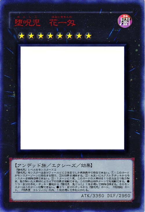 | 「堕呪児」レベル8モンスター×2 「堕呪児」モンスターは自分フィールドに2体までしか表側表示で存在できない。①:このカードがモンスターゾーンに存在する限り、②の効果を適用する。②:お互いにエクストラデッキからモンスターを特殊召喚できない。③:1ターンに1度、このカードのX素材を1つまたは2つ取り除き、取り除いたX素材により以下の効果を発動できる。この効果は相手ターンでも発動できる。●1つ:自分の手札・デッキ・墓地から「堕呪児 鬼ごっこ」1体を選んで特殊召喚する。そのモンスターはこのターン攻撃できない。●2つ:自分のデッキから「堕呪児」カード、「呪祝詞」カード、「呪界匣 コトリバコ」の内、1枚を選んで手札に加える。 | |||