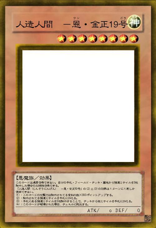 | このカードは通常召喚できない。自分の手札・フィールド・デッキ・墓地から弾道ミサイルを3枚除外した場合のみ特殊召喚できる。 「人造人間(じんぞうにんげん) -恩・金正19号」の(2)と(3)の効果は1ターンに1度しか使用できない。 (1):このカードの攻撃力は除外されてる食料の数×300ポイントアップする。 (2):除外されてる弾道ミサイルを手札に加える。 (3):手札にある弾道ミサイルを3枚除外することで、デッキから核ミサイルを手札に加える。 (4):このカードが破壊された場合、デュエルに敗北する。 | |||