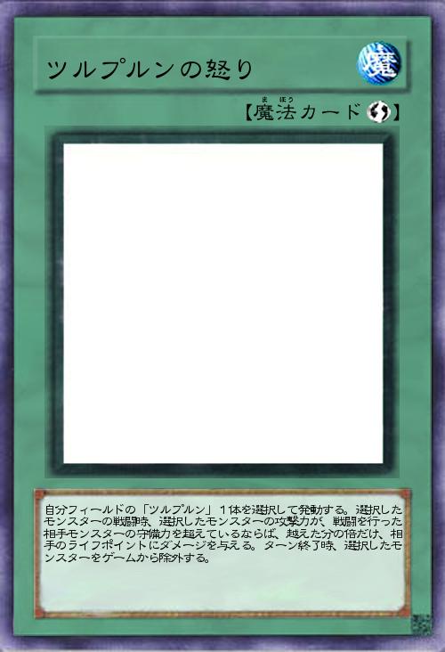 | 自分フィールドの「ツルプルン」1体を選択して発動する。選択したモンスターの戦闘時、選択したモンスターの攻撃力が、戦闘を行った相手モンスターの守備力を超えているならば、越えた分の倍だけ、相手のライフポイントにダメージを与える。ターン終了時、選択したモンスターをゲームから除外する。 | |||